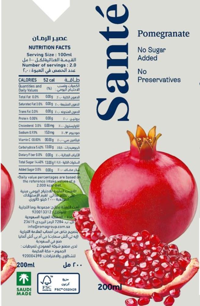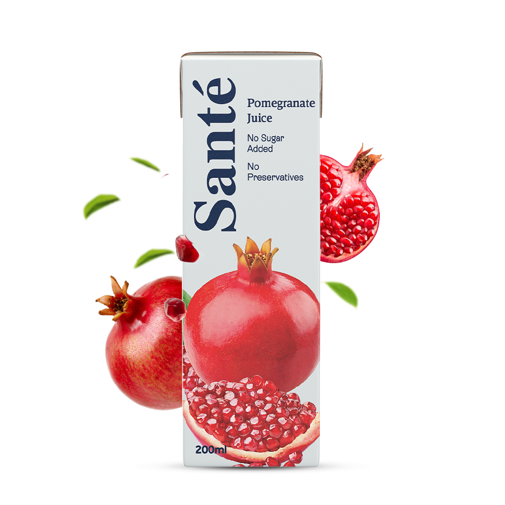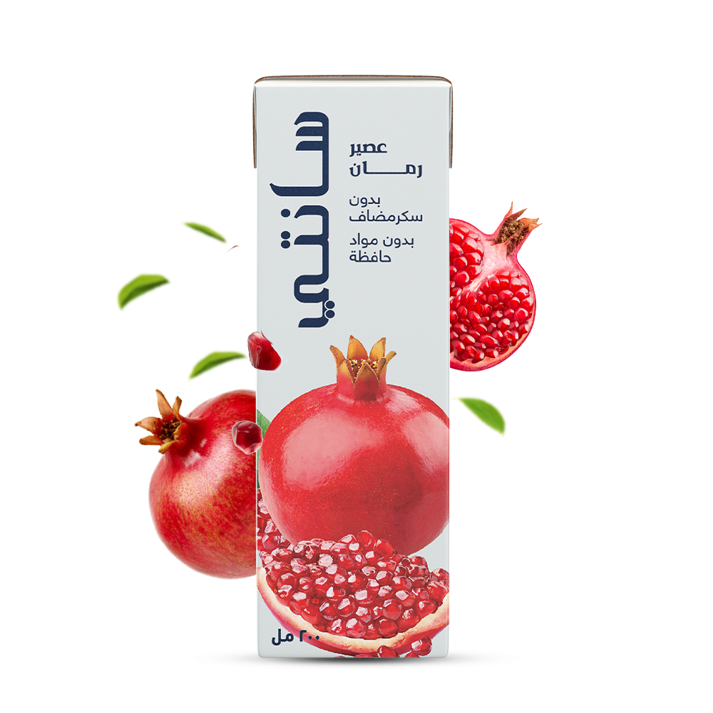 عصير سانتي رمان يقدم لك نكهة الرمان الغنية والمليئة بمضادات الأكسدة، مصنوع من مكونات طبيعية 100% بدون سكر مضاف أو